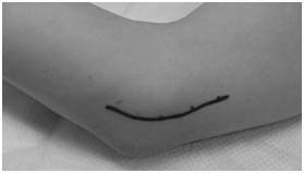藥物治療已經(jīng)完成,但我會指示不要盡可能彎曲肘部。那些真正彎腰的人,或者在睡覺時有強烈癥狀的人,都穿著可拆卸的緊身胸衣以避免肘部。仍然如果在患者有希望的情況下進行手術(shù)治療,例如無法獲得癥狀改善或看到肌肉收縮。在我們的部門,在局部麻醉的麻醉下,在顯微鏡下沿肘內(nèi)側(cè)進行弓形切口,主要進行手術(shù)以壓迫神經(jīng)(圖3)。