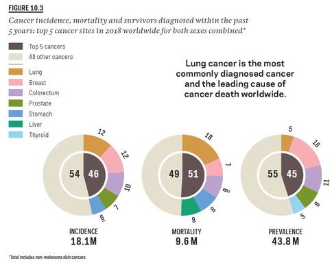 整體來講,肺癌是常發(fā)生的癌癥,2018年共有210萬新發(fā)病例(占比12%),也是主要的癌癥死因(180萬,占比18%)。女性乳腺癌是第二大常發(fā)生的癌癥,因?yàn)槠漕A(yù)后相對較好,癌癥死因中居第5位(圖10.3)。