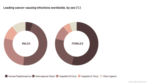 全世界每年約有15%的新癌癥病例歸因于感染,其中2/3發(fā)生在較不發(fā)達(dá)國家。全世界重要的四種致癌感染是幽門螺桿菌(Hp),人乳頭瘤病毒(HPV),乙型肝炎病毒(HBV)和丙型肝炎病毒(HCV),共占所有感染相關(guān)癌癥的90%以上。