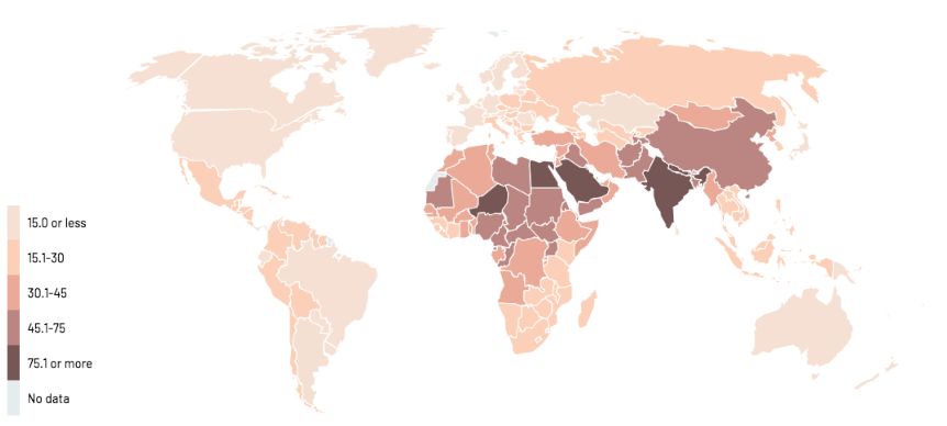 △全球室外空氣中PM2.5濃度(顏色越深,PM2.5濃度越高)