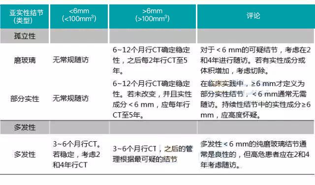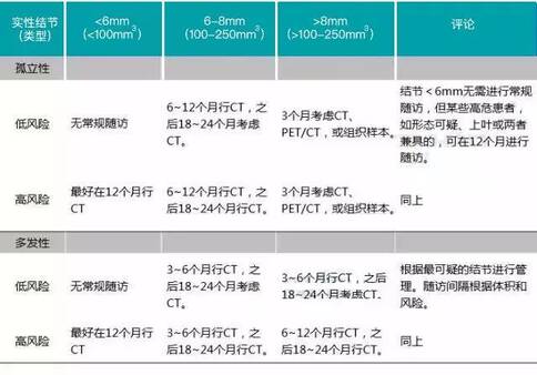 ? ?對(duì)于直徑≥6 mm的孤立性部分實(shí)性結(jié)節(jié),考慮在3~6個(gè)月進(jìn)行短期隨訪以評(píng)估結(jié)節(jié)的持續(xù)性。對(duì)形態(tài)可疑的結(jié)節(jié)(如分葉邊緣或囊性成分),實(shí)性成分增長(zhǎng),或?qū)嵭猿煞郑? mm,建議進(jìn)行PET/CT、活檢或切除(1B等級(jí);強(qiáng)介紹,中質(zhì)量證據(jù))。