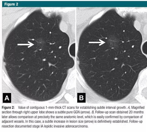 目前,實(shí)性肺癌的容積倍增時(shí)間已經(jīng)明確(容積倍增1倍相當(dāng)于直徑增加26%),且大多數(shù)實(shí)性肺癌的倍增時(shí)間在100-400天之間。亞實(shí)性肺癌結(jié)節(jié),即相當(dāng)于原發(fā)腺癌,更普遍表現(xiàn)為惰性生長(zhǎng),其平均倍增時(shí)間約為3-5年。因此,對(duì)亞實(shí)性結(jié)節(jié)介紹采取初次隨訪時(shí)間的間隔及總隨訪時(shí)間,較實(shí)性結(jié)節(jié)均有所延長(zhǎng)。