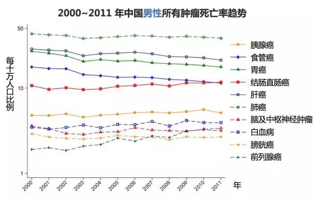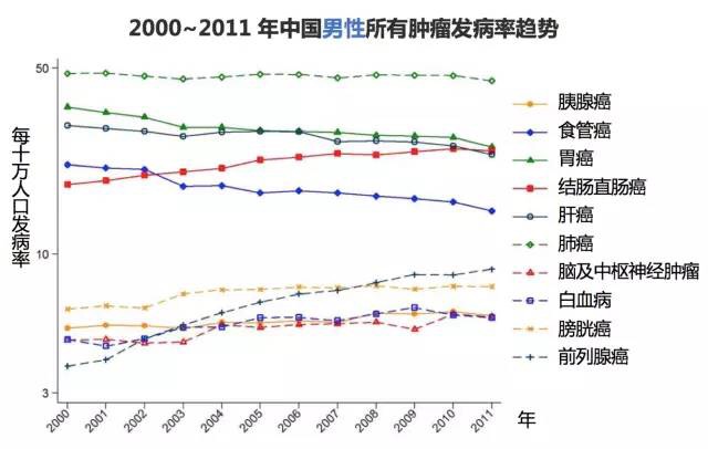 (7) 將所有癌癥歸納在一起,2000年到2011年期間,男性癌癥發(fā)病率保持穩(wěn)定,而女性的發(fā)病率顯著增加(每年21.1%)。